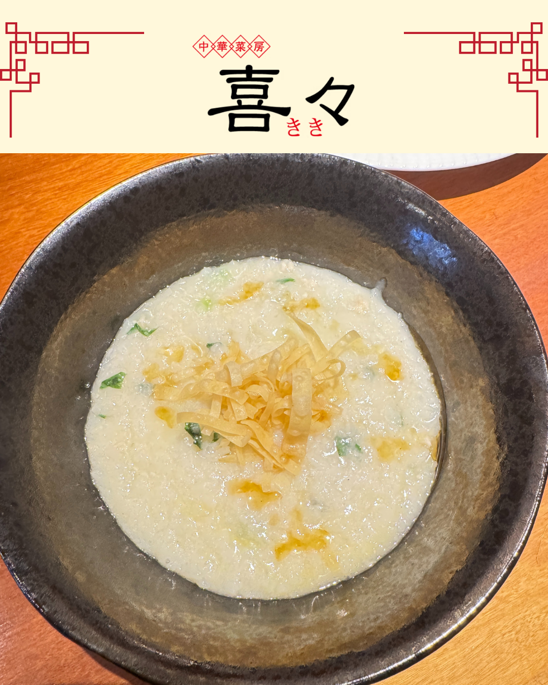 「中華菜房 喜々(ちゅうかさいぼう きき)」は、「野菜粥」は、じっくり炊き上げたお粥に季節の野菜をたっぷりと添えた優しい一品です🌿。