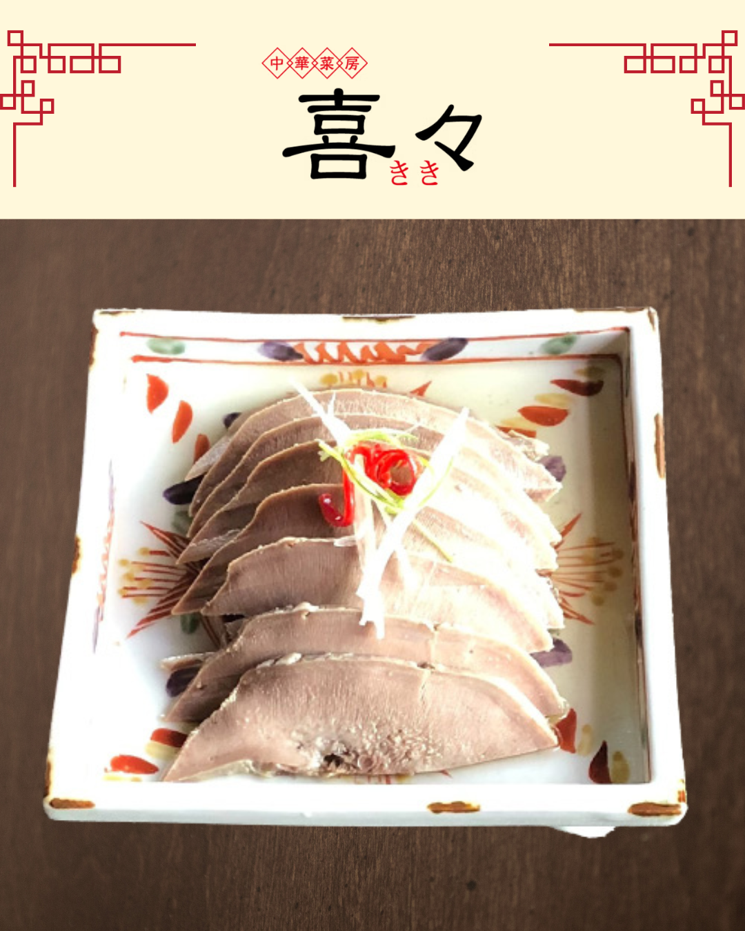 静岡県掛川市の本格中華レストラン【中華菜房 喜々(ちゅうかさいぼう きき)】がご提供する「糟香猪舌」は、豚タンを酒糟や発酵調味料でじっくり漬け込み、旨味を閉じ込めた上海伝統の逸品です。